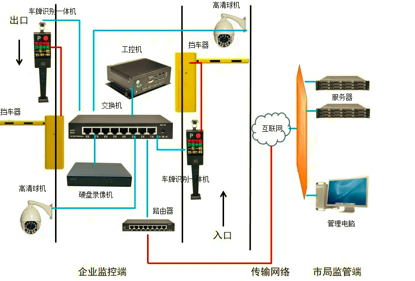 系統(tǒng)自下而上可分為企業(yè)門禁系統(tǒng)、環(huán)保專網(wǎng)和市級(jí)監(jiān)管系統(tǒng)三個(gè)層次。企業(yè)門禁系統(tǒng)由門禁監(jiān)控設(shè)備、機(jī)房設(shè)備及軟件、門衛(wèi)監(jiān)控組成。企業(yè)門禁系統(tǒng)通過環(huán)保專網(wǎng)與市級(jí)監(jiān)管系統(tǒng)交換數(shù)據(jù)、發(fā)起請(qǐng)求或應(yīng)答指令。企業(yè)門禁系統(tǒng)具備車輛信息采集、車輛信息校驗(yàn)、車輛進(jìn)出廠管理、信息統(tǒng)計(jì)、照片采集、視頻監(jiān)控、數(shù)據(jù)儲(chǔ)存和交換等功能。