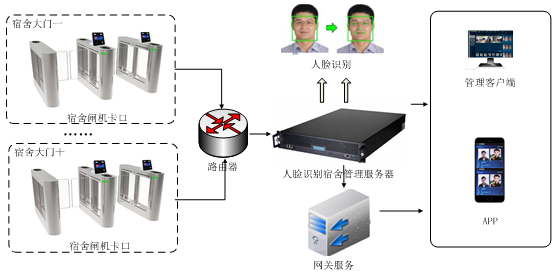 學生宿舍管理系統在宿舍樓大門口、出入口或必經通道口安裝專業的人臉抓拍比對機,在宿管室或監控室部署智能人臉識別宿舍管理系統服務器,通過網絡接入內部局域網,把人臉抓拍機接入到服務器,一臺服務器可以接入多臺人臉抓拍機,管理多個出入口。