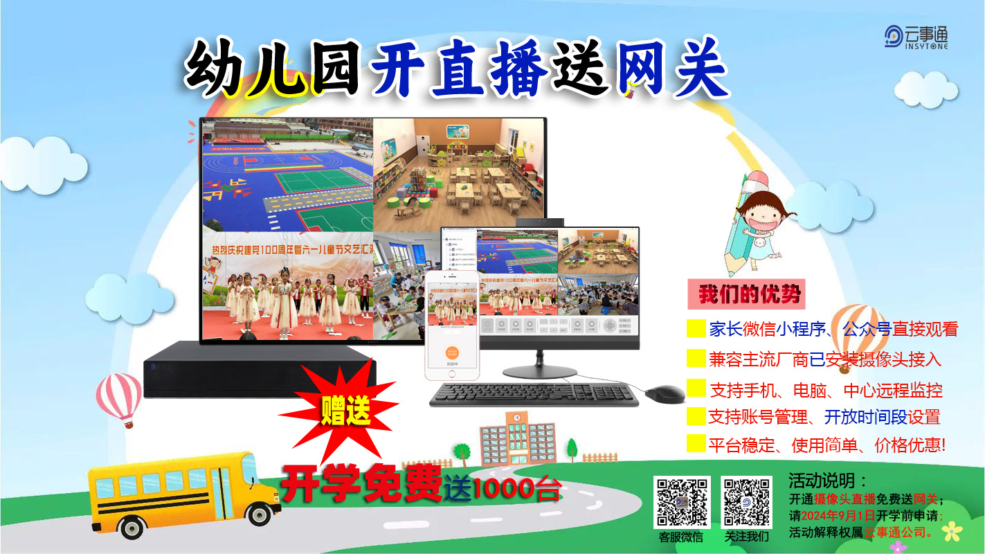 為了回饋幼教行業(yè)新老用戶,我公司在2024年9月1日開學(xué)之前申請攝像頭直播開通服務(wù),免費(fèi)贈送轉(zhuǎn)碼網(wǎng)關(guān),網(wǎng)關(guān)兼容已安裝網(wǎng)絡(luò)攝像頭上云,滿足家長通過微信公眾號、小程序等觀看直播,活動先到先得,送完為目。