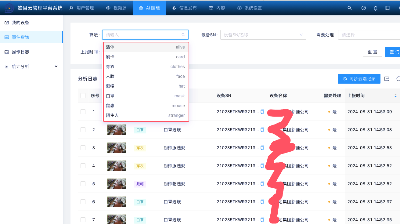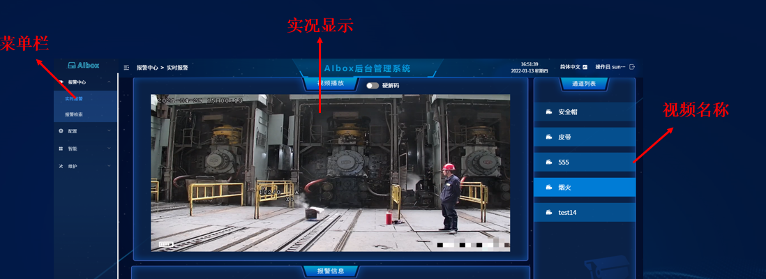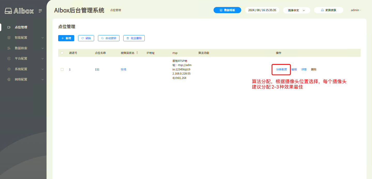 當攝像頭接入成功,我們可以在“實時預警”欄看到視頻畫面,然后分配ai算法成功,開始智能分析功能。