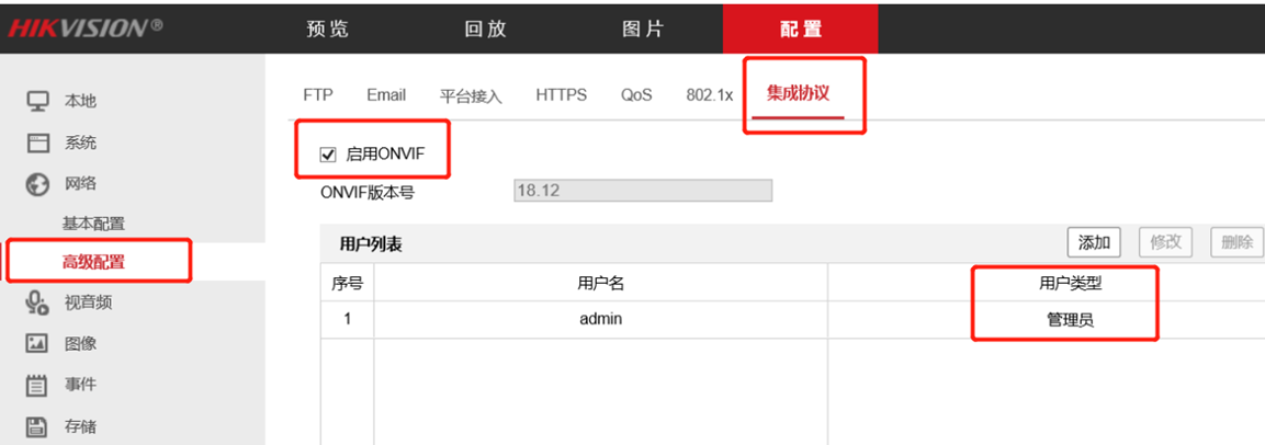 網絡配置---高級配置---啟用ONVIF協議或集成協議,添加管理員(與web登錄用戶名密碼一致即可)用戶,點擊保存;