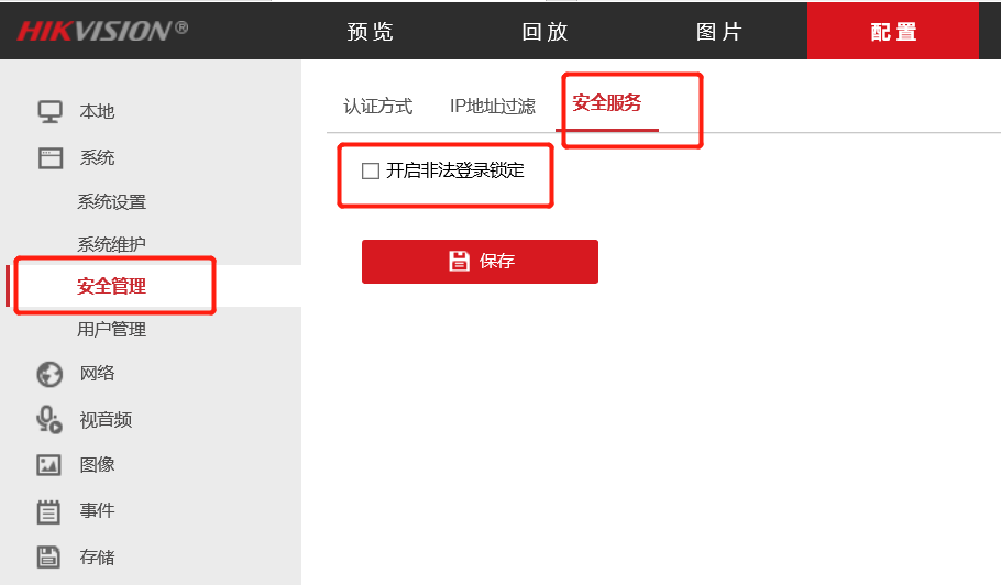 登錄海康相機web界面,配置---系統---安全管理---安全服務,關閉非法登錄鎖定功能,點擊“保存”;