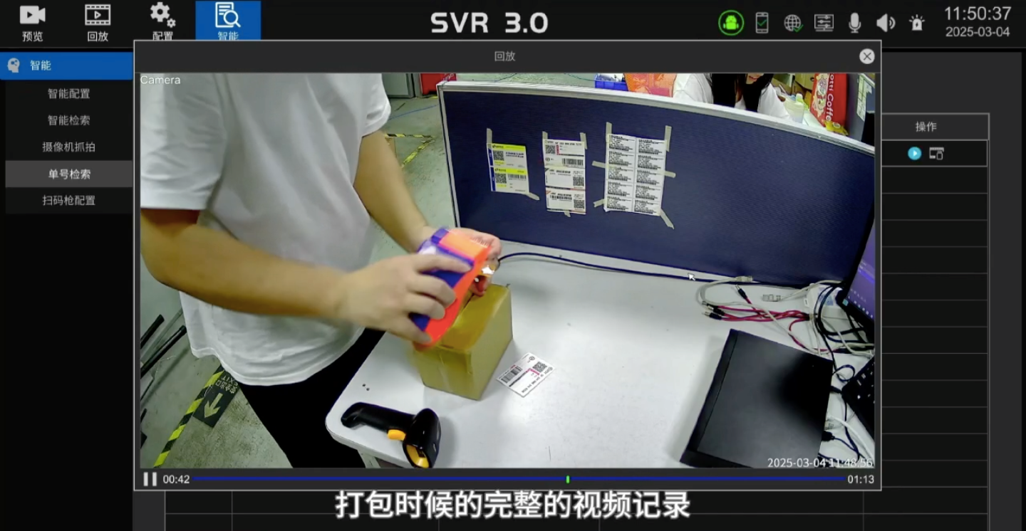 快遞打包監控取證系統在流水線生產崗位和產品檢驗崗位上方部署普通的網絡攝像頭和掃碼槍,可通過掃碼采集產品條形碼數據、掃描時間節點與攝像頭采集的視頻融合,可設置掃描后需要錄像的時間,然后利用條形碼單號快速檢索對應產品生產和檢驗過程中的視頻片段,從而在面臨出現問題時:例如發生因質量問題退貨時,可快速的進行產品可視化溯源。