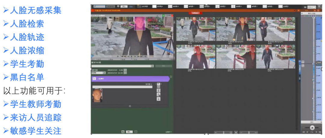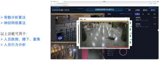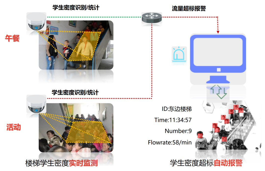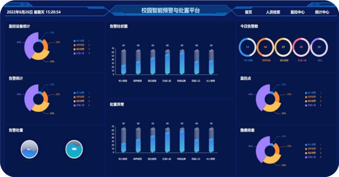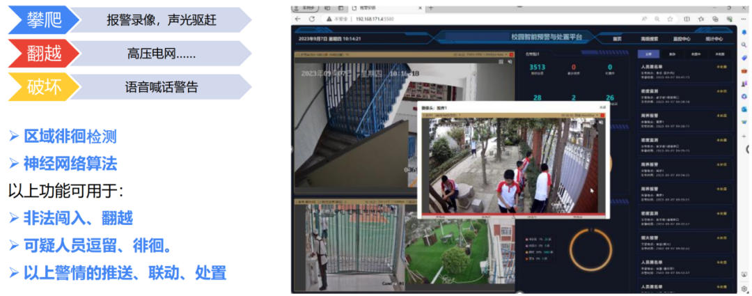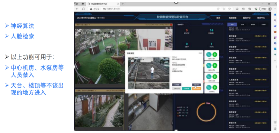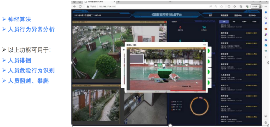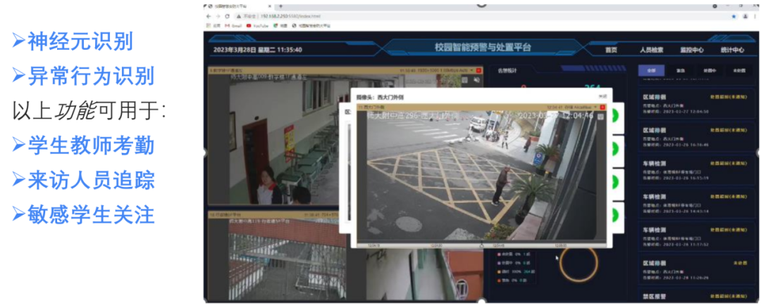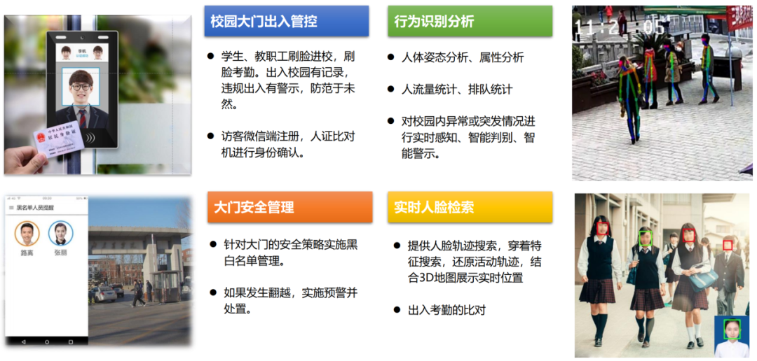 平安校園智能AI隱患預警系統應用人工智能+視頻的技術,在原有平安校園監控基礎上,將學校原有的被動監控轉變為主動防御,實現校園內、外的人、車、物、事的自動監測、智能預警并迅速處置,以及事后高速有效查證,最后大數據呈現。海量攝像機自動管理;多種復雜場景智能預警;平臺數據聯動,提供應急處理方案等。主要應用如下: